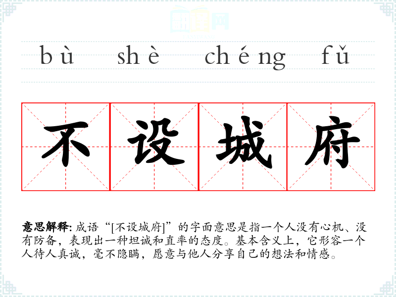 - 日常对话:朋友之间交流时,可以用这个成语来形容某人的坦诚,比如:“她就是一个不设城府的人,和她聊天总是很舒服。”