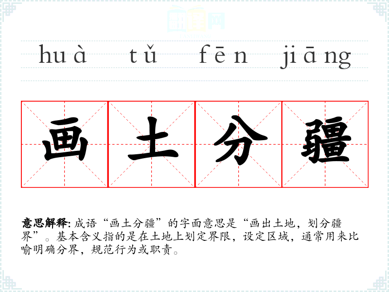 成语“画土分疆”的字面意思是“画出土地,划分疆界”。基本含义指的是在土地上划定界限,设定区域,通常用来比喻明确分界,规范行为或职责。