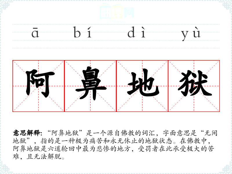 “阿鼻地狱”是一个源自的词汇,字面意思是“无间地狱”,指的是一种极为痛苦和永无休止的地狱状态。在中,阿鼻地狱是六道轮回中最为悲惨的地方,受罚者在此承受极大的苦难,且无法解脱。