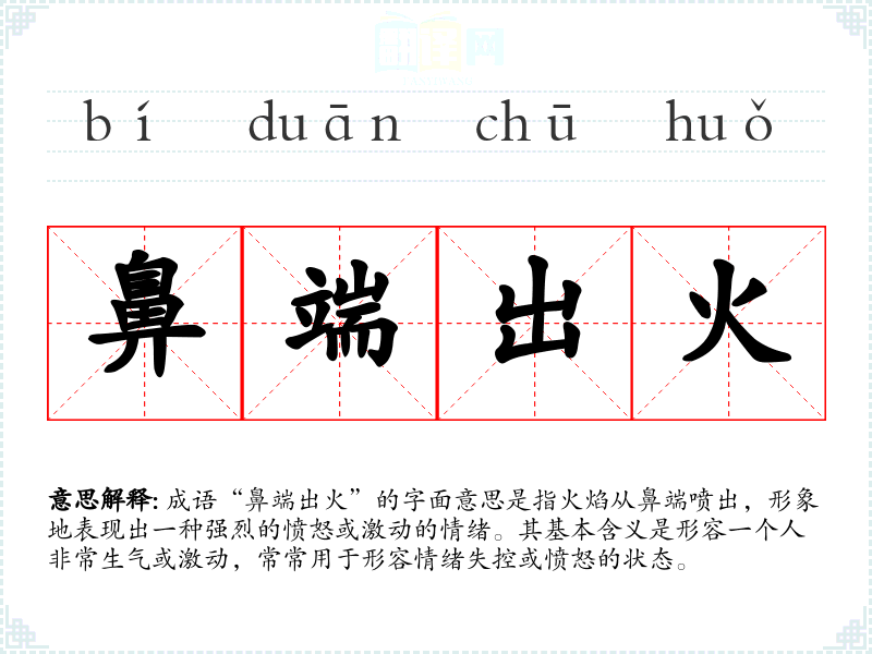 在英语中,类似的表达可以是“seeing red”,同样形象地描述愤怒的状态,但并没有“鼻端出火”这种独特的具体形象。不同文化中对于情绪的表达各有特色,但往往都能通过火焰等象征物来传达强烈的情感。