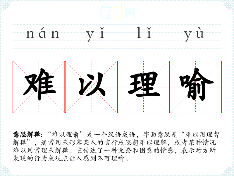“难以理喻”是一个汉语成语,字面意思是“难以用理智解释”,通常用来形容某人的言行或思想难以理解,或者某种情况难以用常理来解释。它传达了一种无奈和困惑的情感,表示对方所表现的行为或观点让人感到不可理喻。