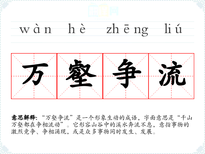 “万壑争流”是一个形象生动的成语,字面意思是“千山万壑都在争相流动”。它形容山谷中的溪水奔流不息,意指事物的激烈竞争、争相涌现,或是众多事物同时发生、发展。