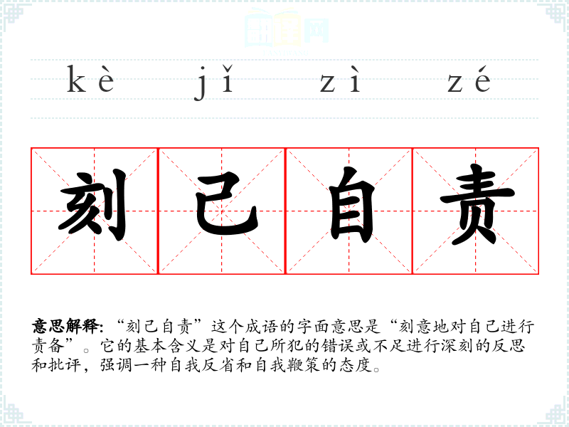 “刻己自责”这个成语的字面意思是“刻意地对自己进行责备”。它的基本含义是对自己所犯的错误或不足进行深刻的反思和批评,强调一种自我反省和自我鞭策的态度。