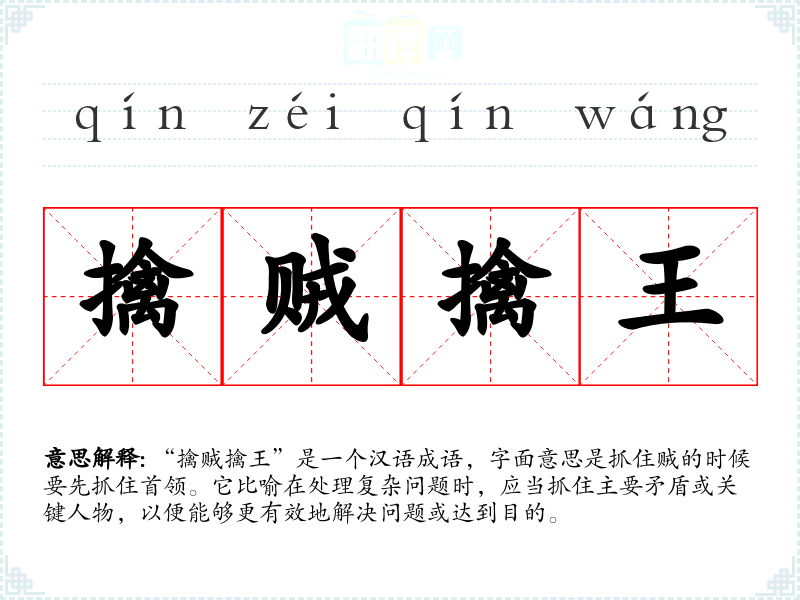 “擒贼擒王”是一个汉语成语,字面意思是抓住贼的时候要先抓住首领。它比喻在处理复杂问题时,应当抓住主要矛盾或关键人物,以便能够更有效地解决问题或达到目的。