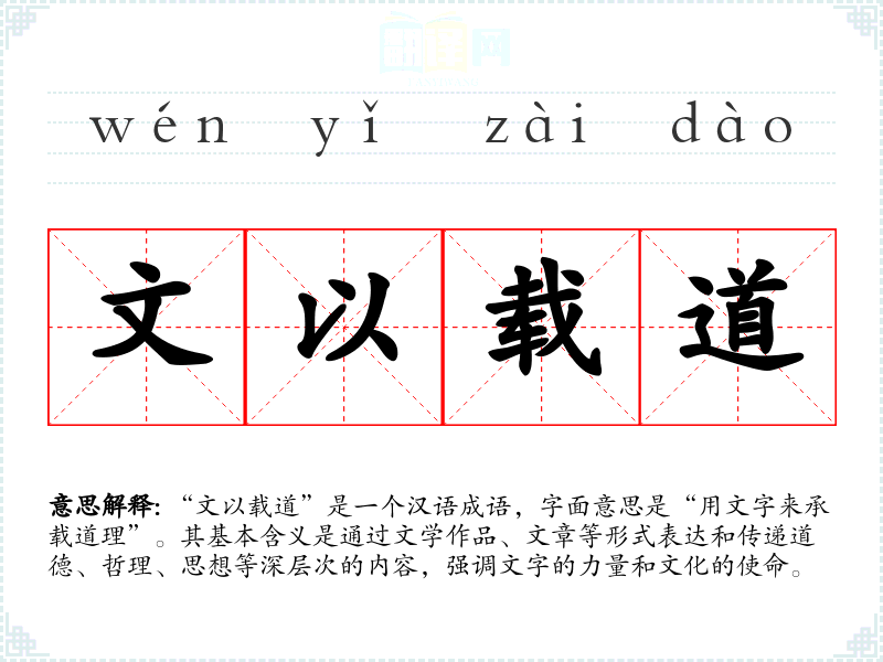 “文以载道”是一个汉语成语,字面意思是“用文字来承载道理”。其基本含义是通过文学作品、文章等形式表达和传递道德、哲理、思想等深层次的内容,强调文字的力量和文化的使命。