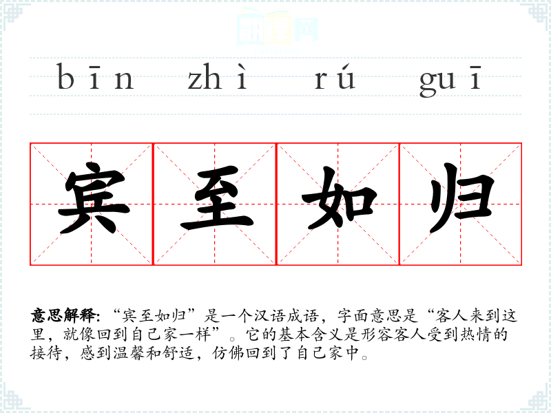 “宾至如归”是一个汉语成语,字面意思是“客人来到这里,就像回到自己家一样”。它的基本含义是形容客人受到热情的接待,感到温馨和舒适,仿佛回到了自己家中。