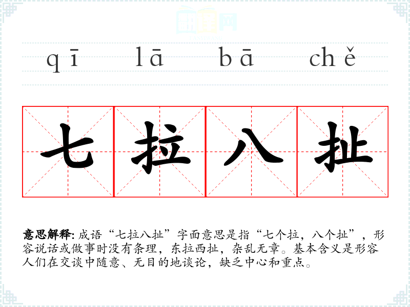 成语“七拉八扯”字面意思是指“七个拉,八个扯”,形容说话或做事时没有条理,东拉西扯,杂乱无章。基本含义是形容人们在交谈中随意、无目的地谈论,缺乏中心和重点。