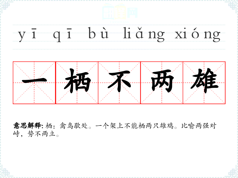 | 一栖不两雄 | 栖:禽鸟歇处。一个架上不能栖两只雄鸡。比喻两强对峙,势不两立。 |