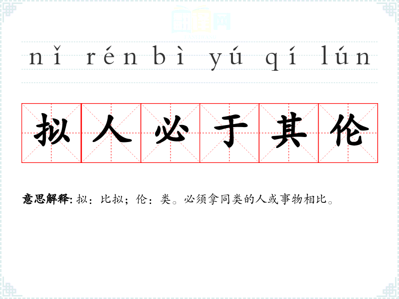 拟:比拟;伦:同类。指比拟某人或某事,一定要用同类或同等的人和事物。 |