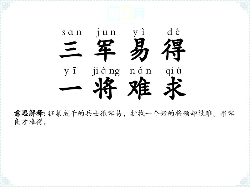 征集成千的兵士很容易,担找一个好的将领却很难。形容良才难得。 |