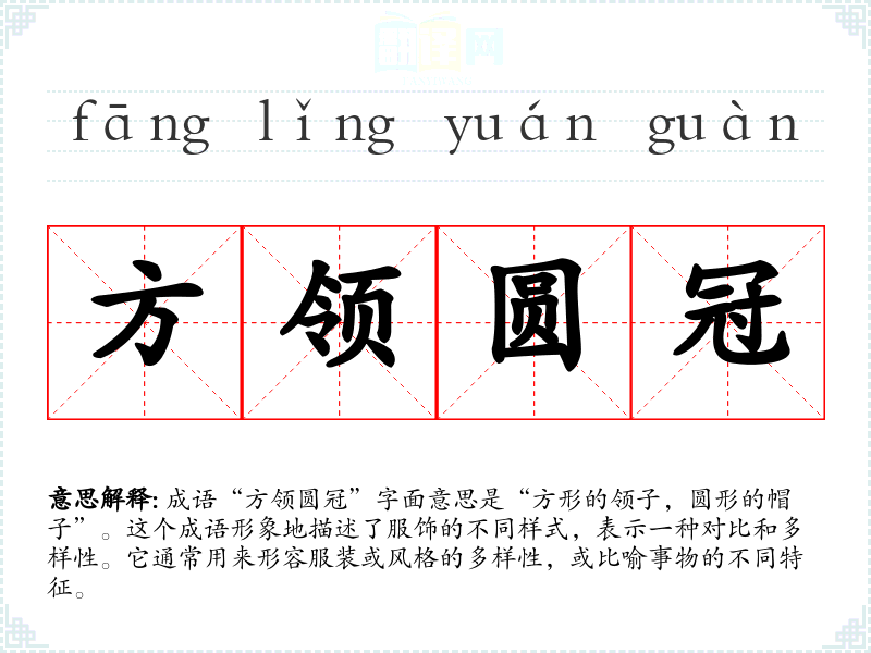 成语“方领圆冠”字面意思是“方形的领子,圆形的帽子”。这个成语形象地描述了服饰的不同样式,表示一种对比和多样性。它通常用来形容服装或风格的多样性,或比喻事物的不同特征。