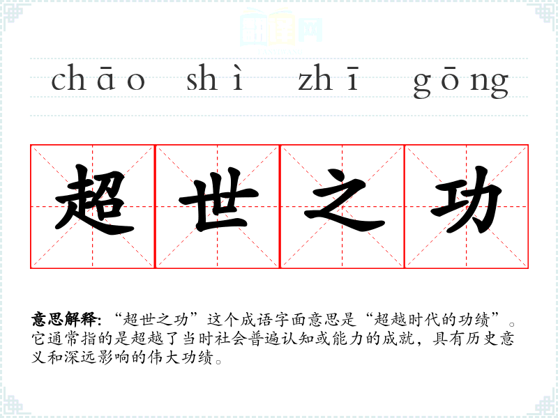 “超世之功”这个成语字面意思是“超越时代的功绩”。它通常指的是超越了当时社会普遍认知或能力的成就,具有历史意义和深远影响的伟大功绩。