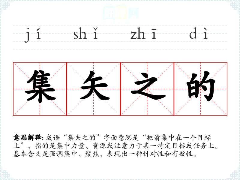 成语“集矢之的”字面意思是“把箭集中在一个目标上”,指的是集中力量、资源或注意力于某一特定目标或任务上。基本含义是强调集中、聚焦,表现出一种针对性和有效性。
