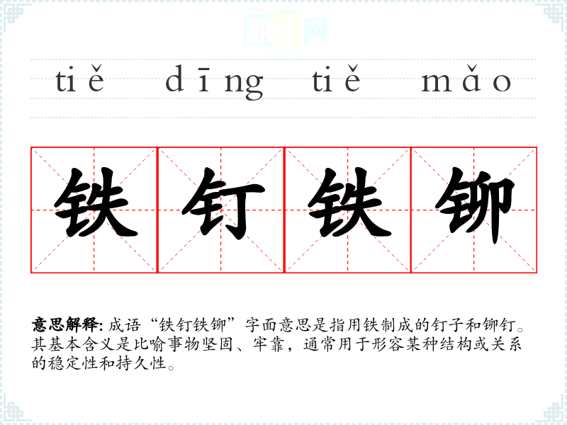 成语“铁钉铁铆”字面意思是指用铁制成的钉子和铆钉。其基本含义是比喻事物坚固、牢靠,通常用于形容某种结构或关系的稳定性和持久性。