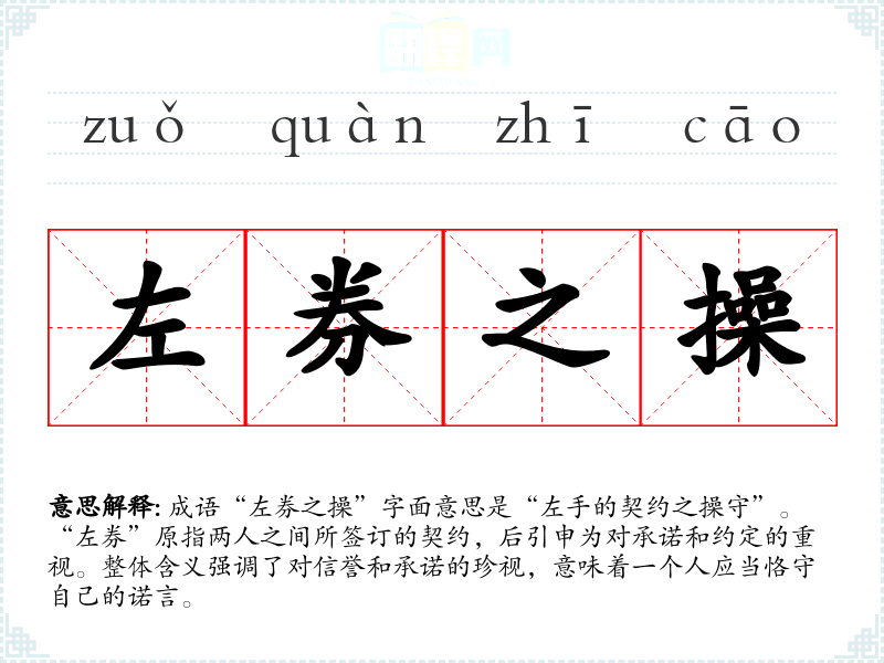 成语“左券之操”字面意思是“左手的契约之操守”。“左券”原指两人之间所签订的契约,后引申为对承诺和约定的重视。整体含义强调了对信誉和承诺的珍视,意味着一个人应当恪守自己的诺言。