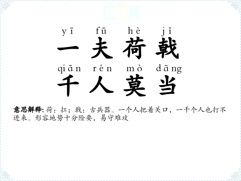 荷:背,负;戈:古代兵器。一个人背着戈把守关隘,一万人也无法前进。比喻地势险要。 |