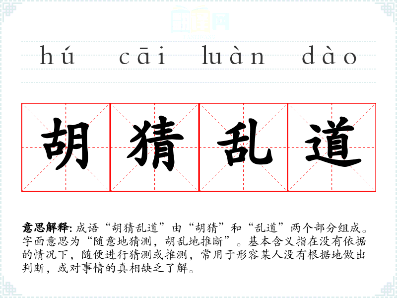 成语“胡猜乱道”由“胡猜”和“乱道”两个部分组成。字面意思为“随意地猜测,胡乱地推断”。基本含义指在没有依据的情况下,随便进行猜测或推测,常用于形容某人没有根据地做出判断,或对事情的真相缺乏了解。