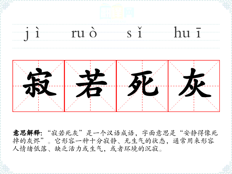 “寂若死灰”是一个汉语成语,字面意思是“安静得像死掉的灰烬”。它形容一种十分寂静、无生气的状态,通常用来形容人情绪低落、缺乏活力或生气,或者环境的沉寂。