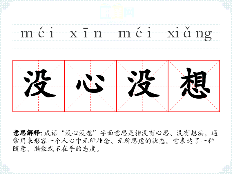 成语“没心没想”字面意思是指没有心思、没有想法,通常用来形容一个人心中无所挂念、无所思虑的状态。它表达了一种随意、懒散或不在乎的态度。