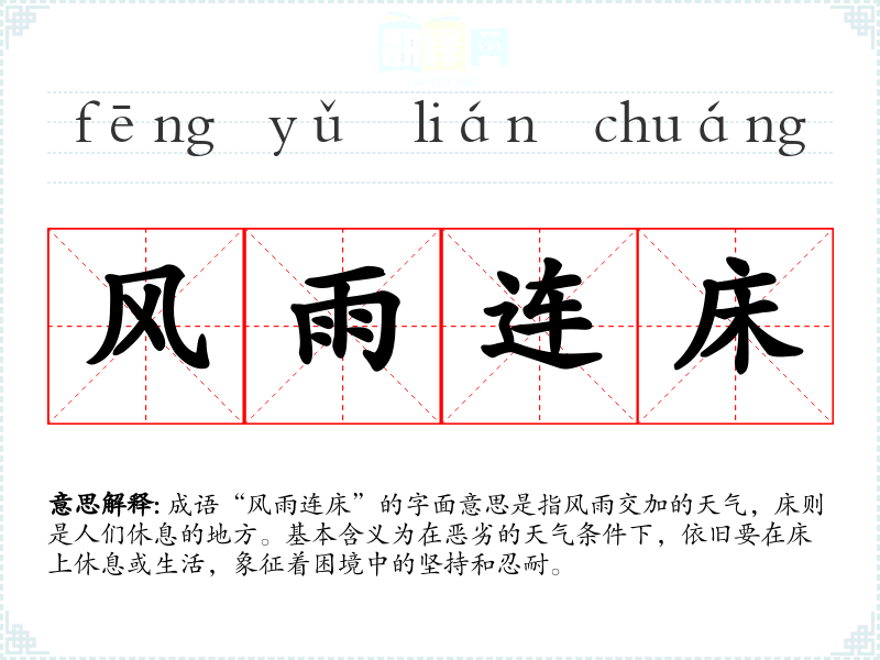 成语“风雨连床”的字面意思是指风雨交加的天气,床则是人们休息的地方。基本含义为在恶劣的天气条件下,依旧要在床上休息或生活,象征着困境中的坚持和忍耐。