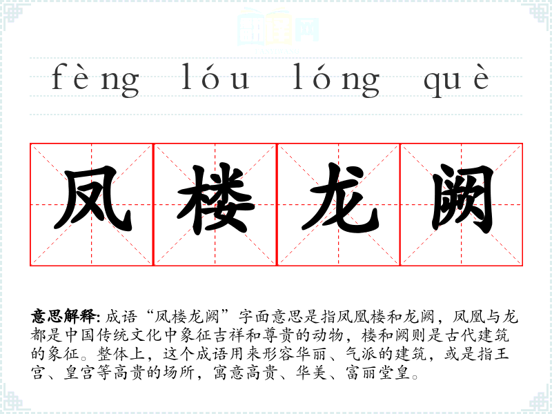 成语“凤楼龙阙”字面意思是指凤凰楼和龙阙,凤凰与龙都是**传统文化中象征吉祥和尊贵的动物,楼和阙则是古代建筑的象征。整体上,这个成语用来形容华丽、气派的建筑,或是指王宫、皇宫等高贵的场所,寓意高贵、华美、富丽堂皇。