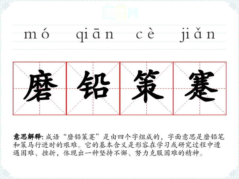 成语“磨铅策蹇”是由四个字组成的,字面意思是磨铅笔和策马行进时的艰难。它的基本含义是形容在学*或研究过程中遭遇困难、挫折,体现出一种坚持不懈、努力克服困难的精神。