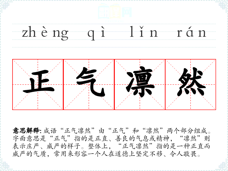 成语“正气凛然”由“正气”和“凛然”两个部分组成。字面意思是“正气”指的是正直、善良的气息或精神,“凛然”则表示庄严、威严的样子。整体上,“正气凛然”指的是一种正直而威严的气质,常用来形容一个人在道德上坚定不移、令人敬畏。