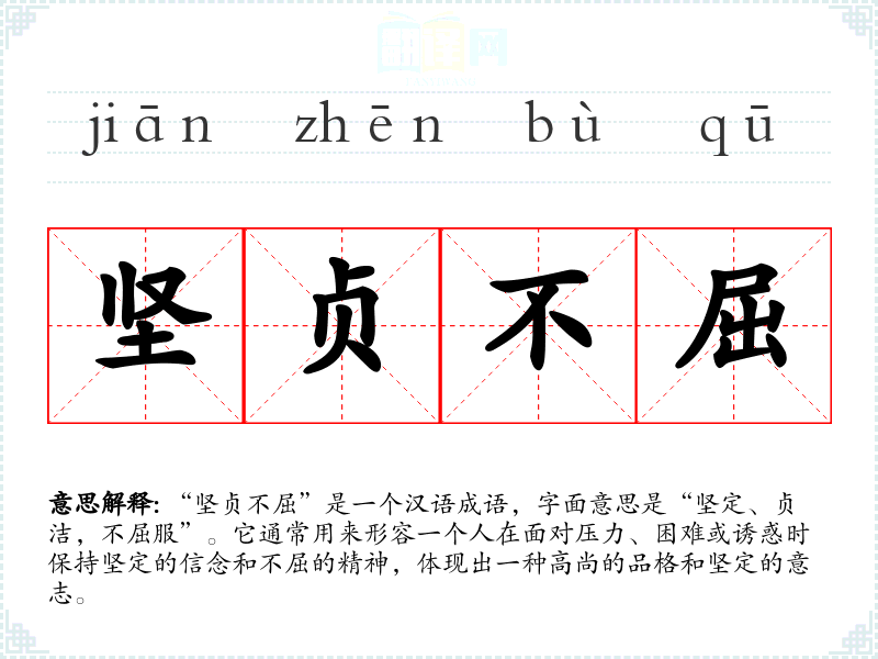 “坚贞不屈”是一个汉语成语,字面意思是“坚定、贞洁,不屈服”。它通常用来形容一个人在面对压力、困难或诱惑时保持坚定的信念和不屈的精神,体现出一种高尚的品格和坚定的意志。