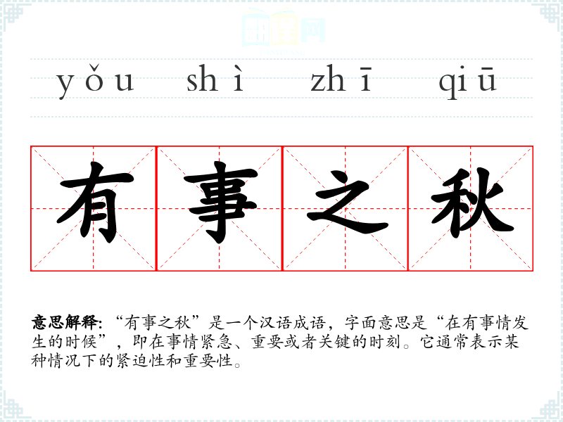 “有事之秋”是一个汉语成语,字面意思是“在有事情发生的时候”,即在事情紧急、重要或者关键的时刻。它通常表示某种情况下的紧迫性和重要性。