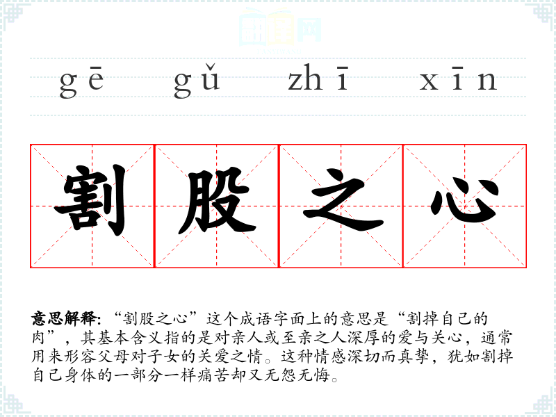 “割股之心”这个成语字面上的意思是“割掉自己的肉”,其基本含义指的是对亲人或至亲之人深厚的爱与关心,通常用来形容父母对子女的关爱之情。这种情感深切而真挚,犹如割掉自己身体的一部分一样痛苦却又无怨无悔。