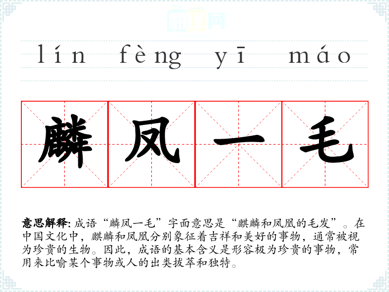 成语“麟凤一毛”字面意思是“麒麟和凤凰的毛发”。在**文化中,麒麟和凤凰分别象征着吉祥和美好的事物,通常被视为珍贵的生物。因此,成语的基本含义是形容极为珍贵的事物,常用来比喻某个事物或人的出类拔萃和独特。