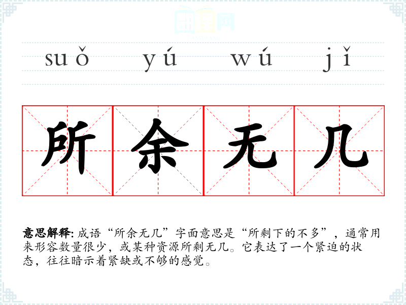 成语“所余无几”字面意思是“所剩下的不多”,通常用来形容数量很少,或某种资源所剩无几。它表达了一个紧迫的状态,往往暗示着紧缺或不够的感觉。