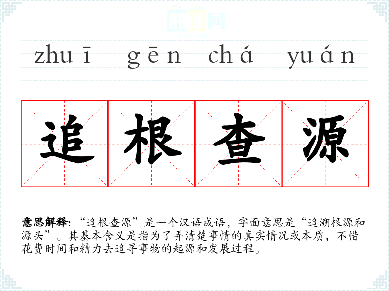 “追根查源”是一个汉语成语,字面意思是“追溯根源和源头”。其基本含义是指为了弄清楚事情的真实情况或本质,不惜花费时间和精力去追寻事物的起源和发展过程。