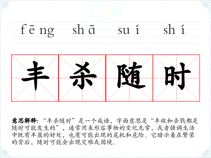 “丰杀随时”是一个成语,字面意思是“丰收和杀戮都是随时可能发生的”,通常用来形容事物的变化无常,或者强调生活中既有丰盈的好处,也有可能出现的危机和危险。它暗示着在繁荣的背后,随时可能会出现灾难或困境。