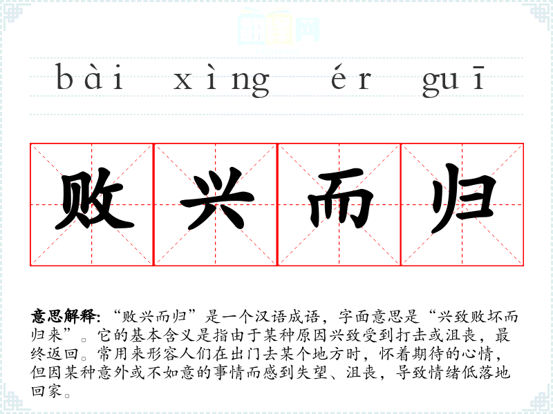 “败兴而归”源于古代文学,具体出处并不明确,但其构造可以拆解为“败兴”和“而归”两个部分。“败兴”表示兴致的失败或消沉,而“而归”则是回到原来的地方。成语的使用可以追溯到古典诗词和散文中,常常用以描绘游玩或聚会后的失落感。