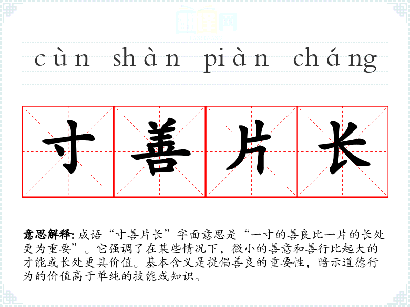 成语“寸善片长”字面意思是“一寸的善良比一片的长处更为重要”。它强调了在某些情况下,微小的善意和善行比起大的才能或长处更具价值。基本含义是提倡善良的重要性,暗示道德行为的价值高于单纯的技能或知识。