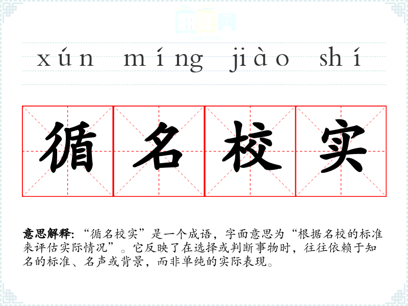 “循名校实”是一个成语,字面意思为“根据名校的标准来评估实际情况”。它反映了在选择或判断事物时,往往依赖于知名的标准、名声或背景,而非单纯的实际表现。