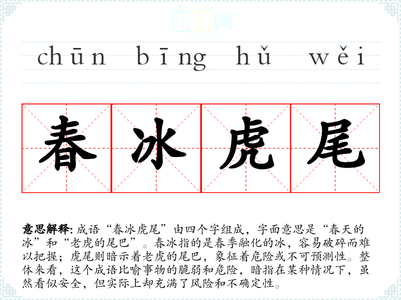 成语“春冰虎尾”由四个字组成,字面意思是“春天的冰”和“的尾巴”。春冰指的是春季融化的冰,容易破碎而难以把握;虎尾则暗示着的尾巴,象征着危险或不可预测性。整体来看,这个成语比喻事物的脆弱和危险,暗指在某种情况下,虽然看似安全,但实际上却充满了风险和不确定性。