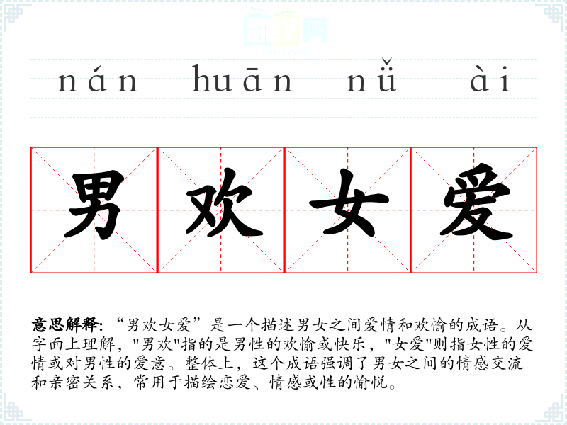 “男欢女爱”是一个描述男女之间爱情和欢愉的成语。从字面上理解,"男欢"指的是男性的欢愉或快乐,"女爱"则指女性的爱情或对男性的爱意。整体上,这个成语强调了男女之间的情感交流和亲密关系,常用于描绘恋爱、情感或性的愉悦。