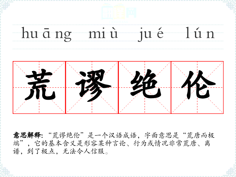 “荒谬绝伦”是一个汉语成语,字面意思是“荒唐而极端”,它的基本含义是形容某种言论、行为或情况非常荒唐、离谱,到了极点,无法令人信服。