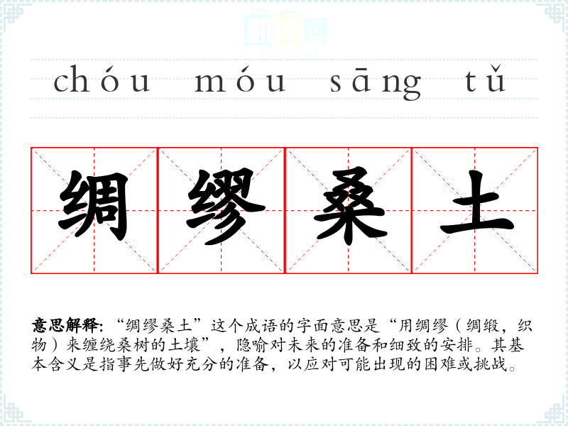 “绸缪桑土”这个成语的字面意思是“用绸缪(绸缎,织物)来缠绕桑树的土壤”,隐喻对未来的准备和细致的安排。其基本含义是指事先做好充分的准备,以应对可能出现的困难或挑战。