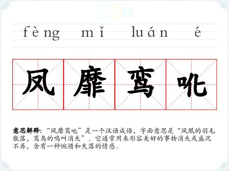 “凤靡鸾吪”是一个汉语成语,字面意思是“凤凰的羽毛散落,鸾鸟的鸣叫消失”。它通常用来形容美好的事物消失或盛况不再,含有一种惋惜和失落的情感。