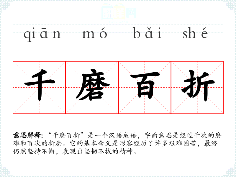 “千磨百折”是一个汉语成语,字面意思是经过千次的磨难和百次的折磨。它的基本含义是形容经历了许多艰难困苦,最终仍然坚持不懈,表现出坚韧不拔的精神。