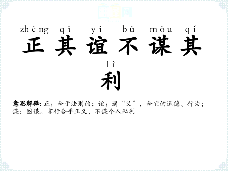 | 正其谊不谋其利 | 正:合于法则的;谊:通“义”,合宜的道德、行为;谋:图谋。言行合乎正义,不谋个人私利 |