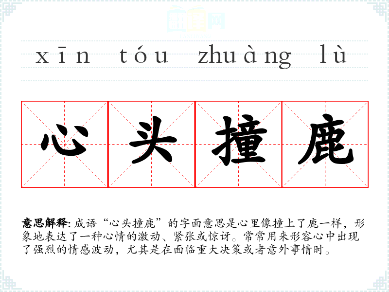 - 反义成语:心如止水、泰然自若。这些成语描述了一种平静、安定的心态,正好与“心头撞鹿”的激动形成对比。