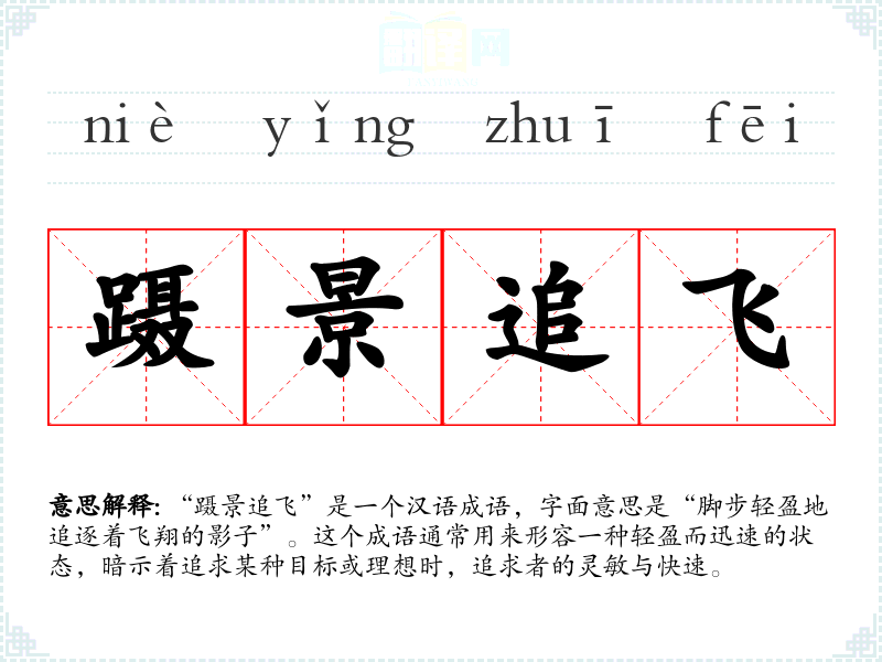 “蹑景追飞”是一个汉语成语,字面意思是“脚步轻盈地追逐着飞翔的影子”。这个成语通常用来形容一种轻盈而迅速的状态,暗示着追求某种目标或理想时,追求者的灵敏与快速。