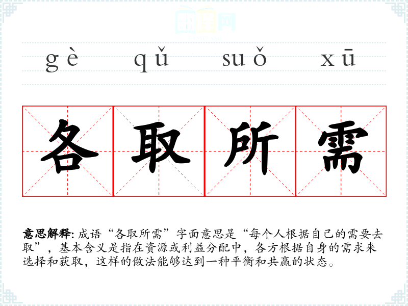 成语“各取所需”字面意思是“每个人根据自己的需要去取”,基本含义是指在资源或利益分配中,各方根据自身的需求来选择和获取,这样的做法能够达到一种平衡和共赢的状态。