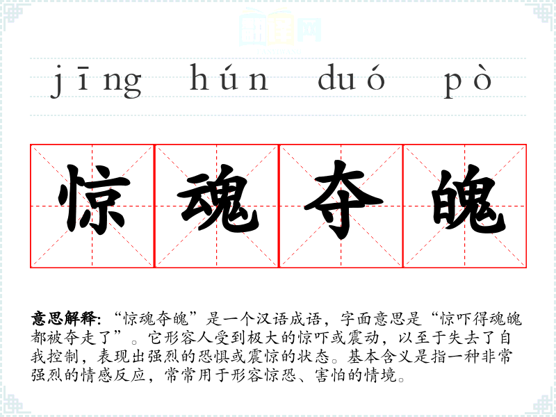 “惊魂夺魄”是一个汉语成语,字面意思是“惊吓得魂魄都被夺走了”。它形容人受到极大的惊吓或震动,以至于失去了自我控制,表现出强烈的恐惧或震惊的状态。基本含义是指一种非常强烈的情感反应,常常用于形容惊恐、害怕的情境。