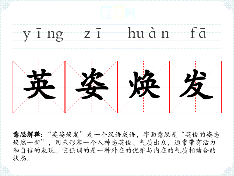 在**文化中,外在的形象常常与一个人的内在品质相联系,“英姿焕发”作为一种积极的形象,反映了社会对个人修养和气质的重视。在现代社会,则常用于形容那些在职业、学业或其他领域取得成就的人,传达出社会对成功人士的赞美与欣赏。