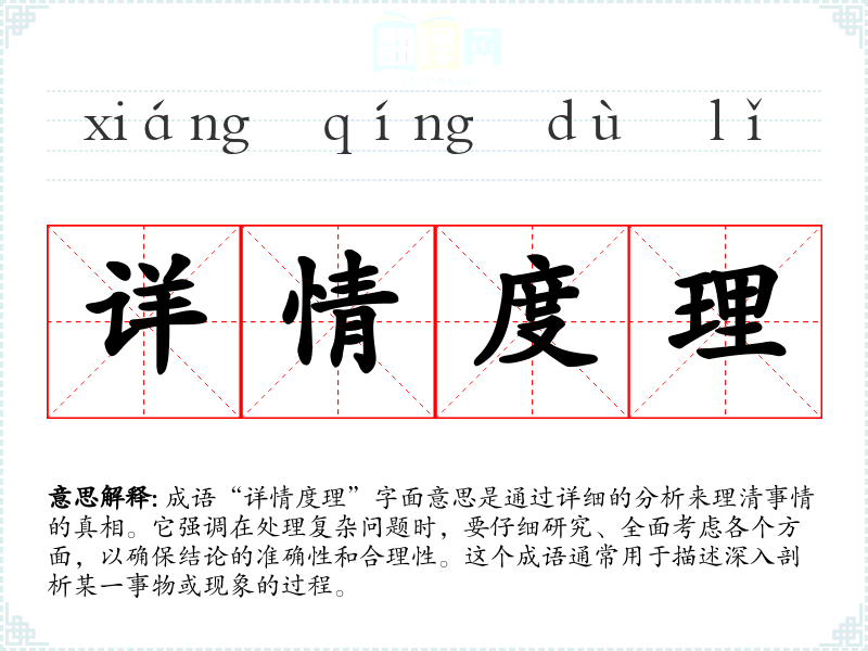 成语“详情度理”字面意思是通过详细的分析来理清事情的真相。它强调在处理复杂问题时,要仔细研究、全面考虑各个方面,以确保结论的准确性和合理性。这个成语通常用于描述深入剖析某一事物或现象的过程。